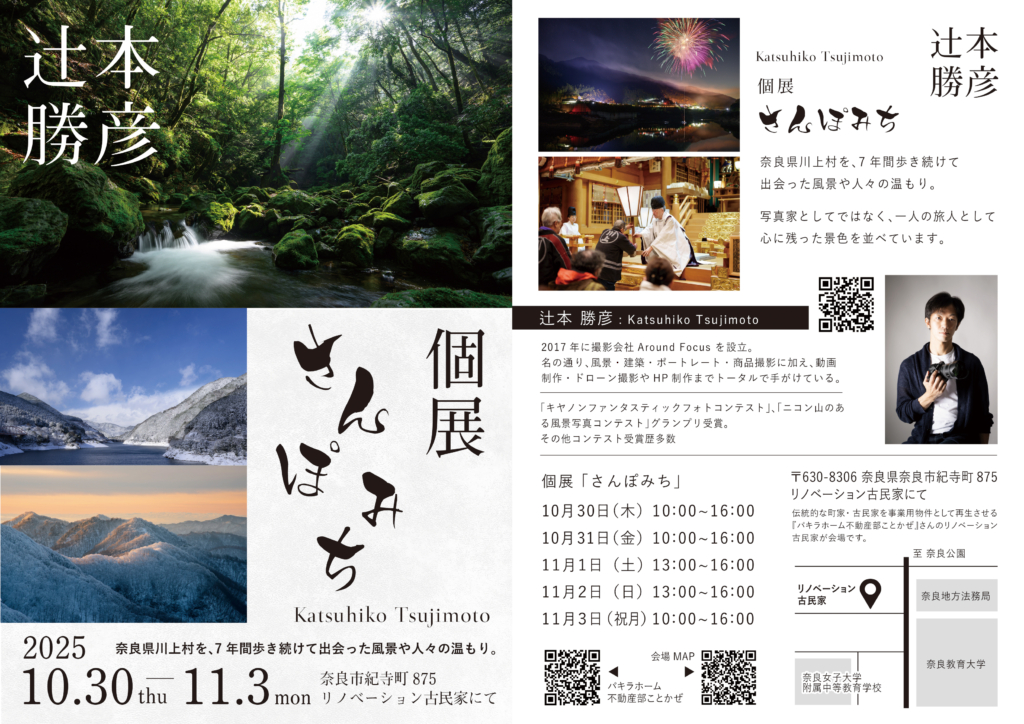 お知らせ TOP>お知らせ>2025年10月30日~11月3日 Around Focus 辻本勝彦氏の写真展開催とオープンハウス 2025年10月30日~11月3日 Around Focus 辻本勝彦氏の写真展開催とオープンハウス 2025.08.19 2025年10月30日~11月3日にてオープンハウスを行い、Around Focusの辻本氏の写真展開催を致します。 https://around-focus.jp/ 貸家として復活する町家で 借主様のご入居前に 辻本氏が撮影しました写真を展示します。 2025年10月30日31日 奈良県吉野郡川上村の移住促進イベント開催 一覧に戻る